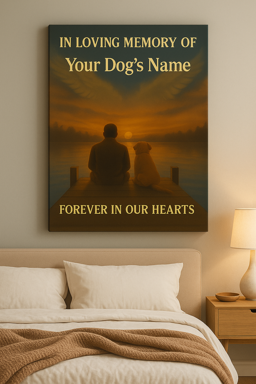 This personalized memorial canvas is a heartfelt tribute to the unbreakable bond between you and your dog. Featuring a touching sunset scene of a man and his best friend, it serves as a reminder that love never fades, even after loss.