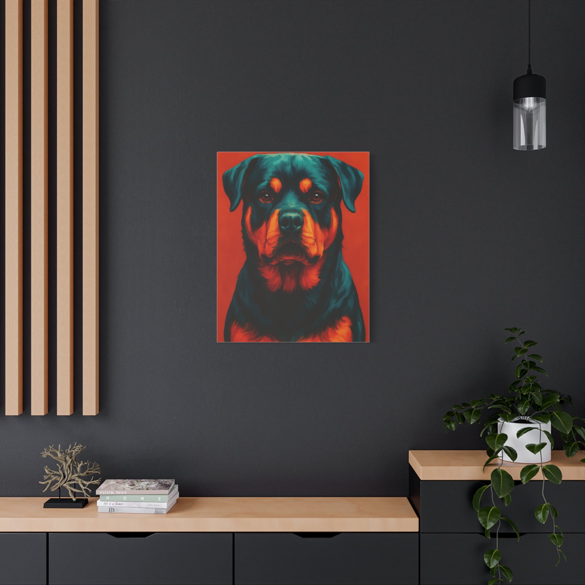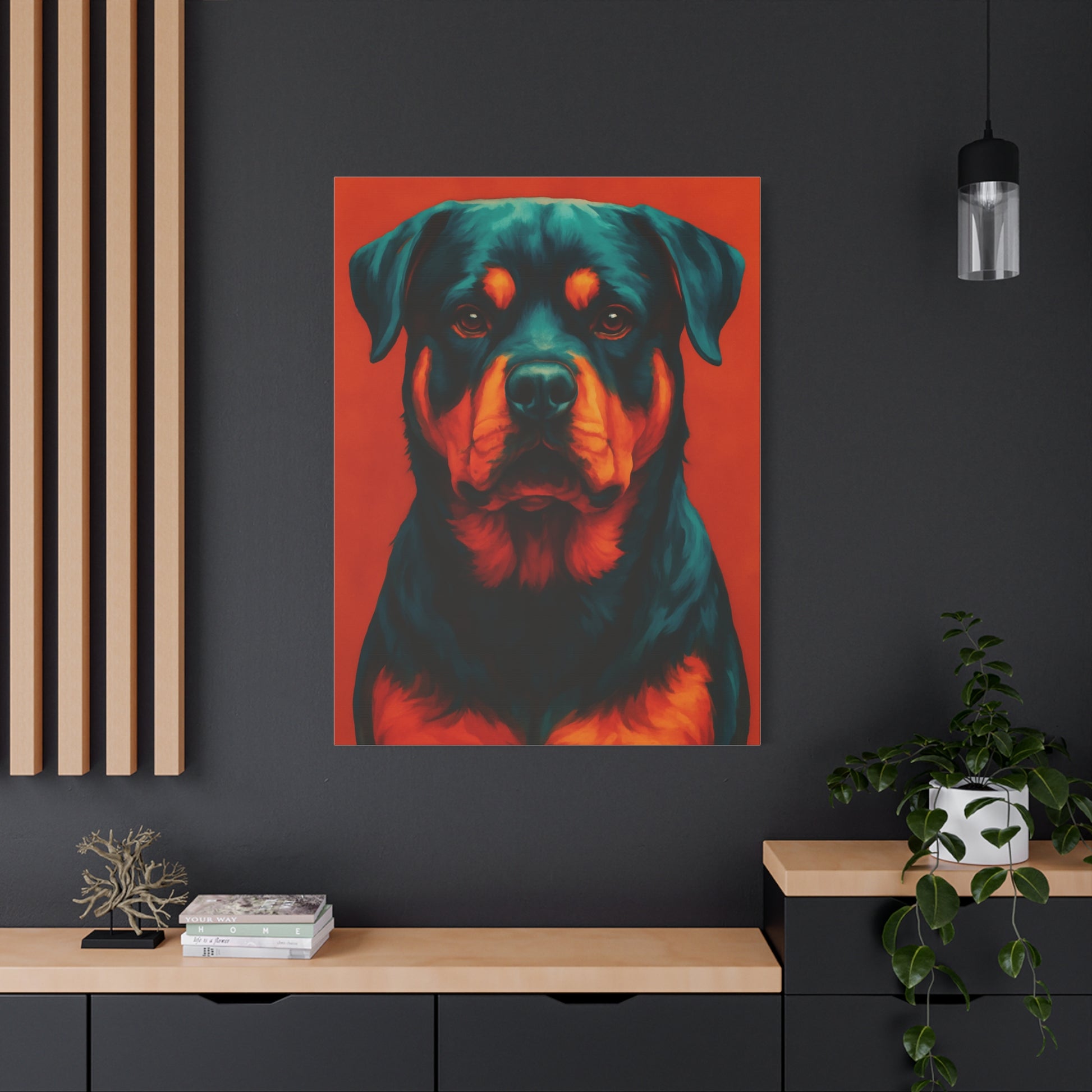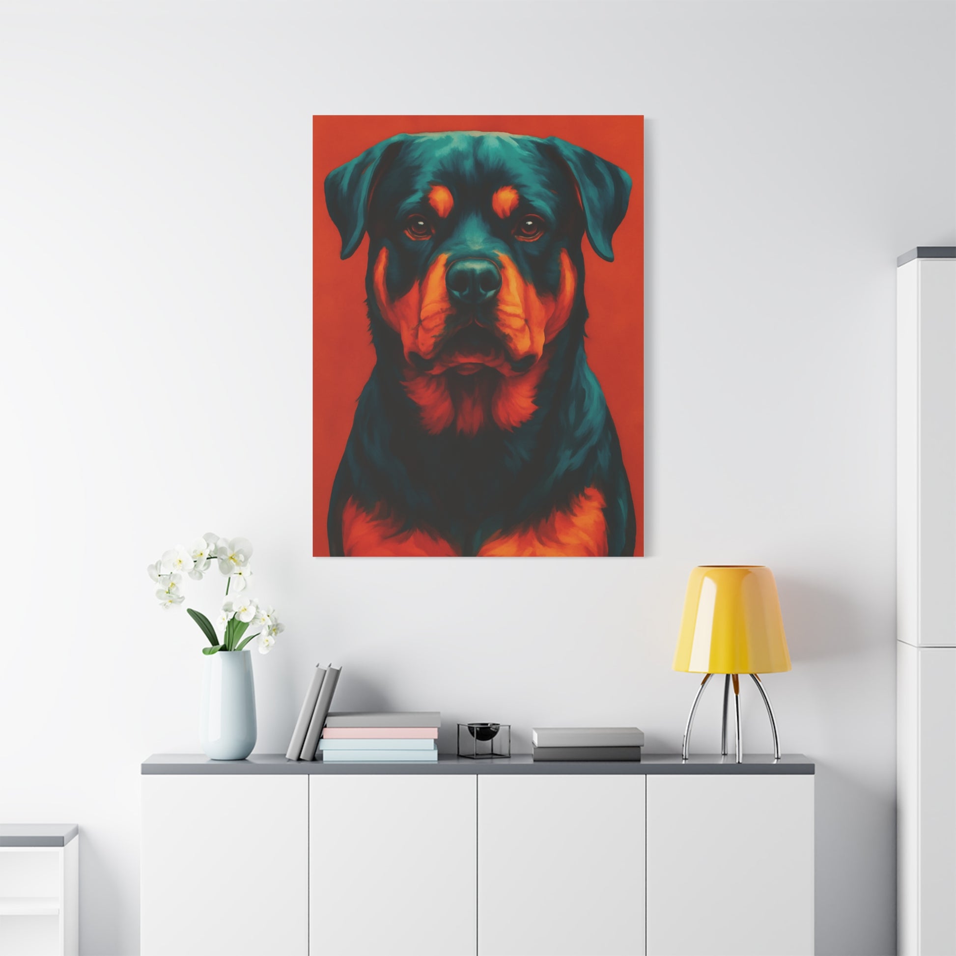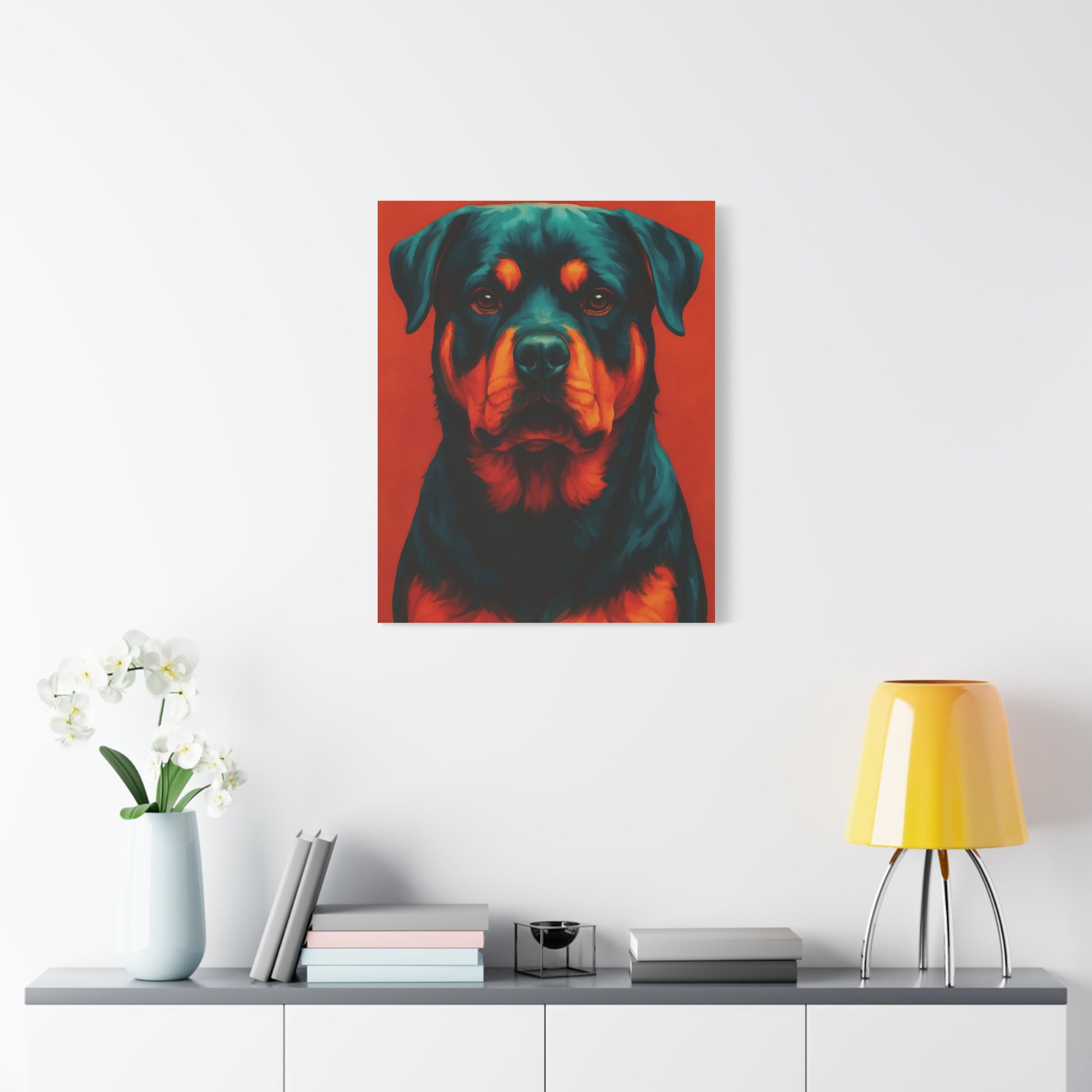 Powerful, loyal, and full of personality — this Rottweiler wall art captures the true spirit of one of the most iconic breeds. With its bold colors and modern artistic style, this canvas print makes a striking statement piece for living rooms, bedrooms, offices, or pet spaces.